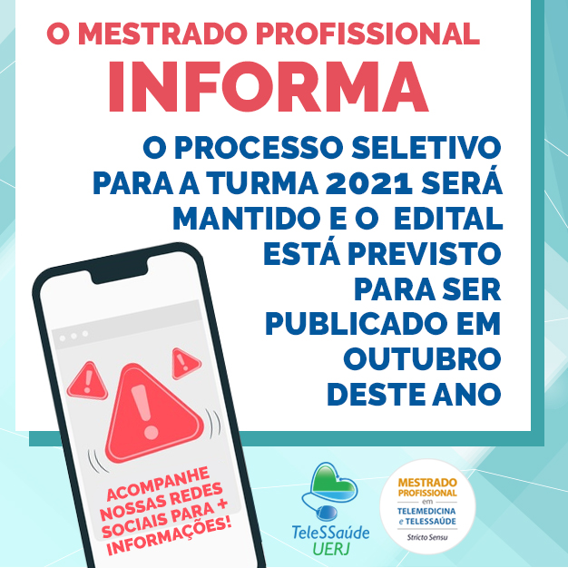 O Mestrado Profissional em Telemedicina e Telessaúde informa: que o Processo Seletivo para a Turma 2021 será mantido e que o edital está previsto para ser publicado em outubro deste ano.